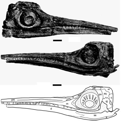 图1 邓氏萨斯特鱼龙头骨(IGGCAS 2005F001)侧视照片及左侧视线条图,比例尺为5厘米。(尚庆华供图)