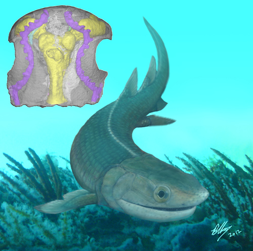 奇异东生鱼生态复原图(古脊椎所Brian Choo绘制)以及脑颅三维虚拟复原图