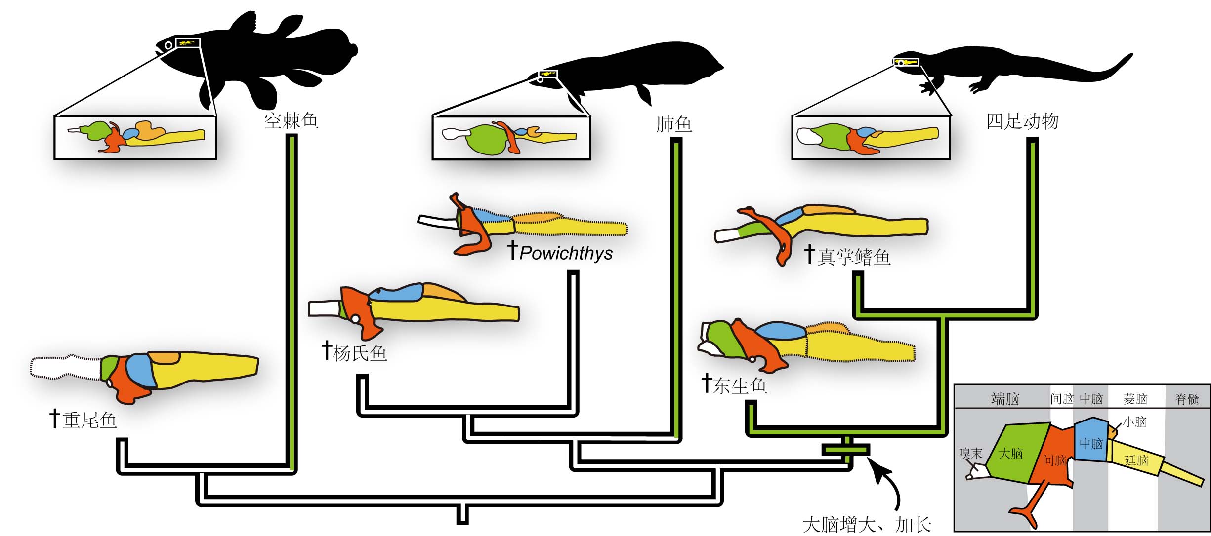 肉鳍鱼类脑演化示意图,指示大脑的增大与加长在四足动物演化初期即已发生