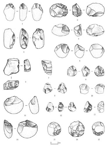 图3(a) 蓝田新发现的石制品。1. 手镐(斧?,LTP03:06);2-4,7,10. 刮削器(LTP02:537,LTP01:108,LTP02:534,LTP02:544,LTP02:543);5,11,14. 砍砸器(LTP02:526,LTP05:20,LTP02:488);6. 石核(LTP01:037);8,9. 手斧(LTP02:549,LTP02:518);12,13. 尖状器(LTP02:504,LTP02:510);15-17. 石球(LTP02:524,LTP02:489,LTP01:103)(王社江供图)