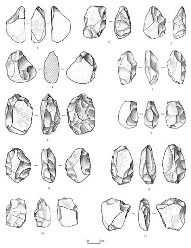 图3(b) 蓝田新发现的石制品。1,3. 手镐(LTP02:483,LTP01:100);2,10. 薄刃斧(LTP02:533,LTP02:527);4-9. 手斧(LTP02:540,LTP02:541,LTP02:528,LTP03:12,LTP02:532,LTP02:536);11. 刮削器(LTP02:538)(王社江供图)