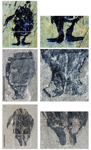 近年来,朗教授和他的同事在对盾皮鱼类的生殖方式研究中取得了一系列新发现,受到激励,他们又开始兴致勃勃地寻找胴甲鱼类生殖方式的化石证据。在对大量的小肢鱼化石进行检视后他们发现,有些小肢鱼腹面躯体甲壳末端有一对奇怪的侧枝,有些则没有。这种侧枝结构与之前发现的褶齿鱼类鳍脚十分相似。因此,它应当是雄性外生殖器的骨骼部分。而雌性小肢鱼的化石则没有这种侧枝,取而代之的是一对骨板(图1)。