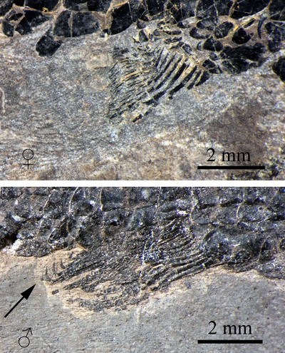 图3:精美乌沙鱼的雌雄和雄性臀鳍对比, 箭头指示雄性臀鳍上的钩子(徐光辉供图)