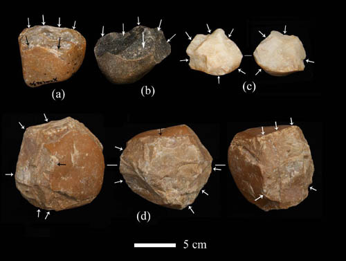 图2 丹江流域马岭2A地点遗址出土的砍砸器(a, b, c) 和多面体石核(d)(裴树文供图)