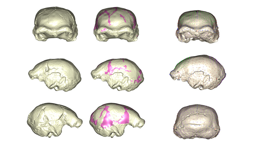 研究人员对和县直立人颅骨采用基于半标志点的三维几何形态测量方法量化和县头骨的表面形态特征,并与非洲和亚洲地区直立人进行对比。结果发现1) 和县直立人的脑颅形态最接近中国其他直立人,其中整体脑颅形态和脑颅后与周口店直立人最为接近,而其额骨总体形态与南京直立人1号头骨最为接近,这说明和县直立人与中国其他直立人具有更近的亲缘关系;2) 和县直立人的脑颅颅壁较厚,最大宽较大并且最大宽位置靠后,保持了相对原始的状态,这与印尼早更新世直立人十分接近而区别于中国其他直立人,这说明和县直立人在这些方面相比于周口店直立人,与印尼直立人之间的关系更加密切,这种相似性可能是中国和印尼直立人共同祖先的特征在和县直立人中的保存。