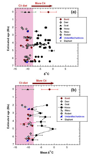 图2 榆社盆地食草哺乳动物釉质样品的稳定碳同位素:(a)全量δ13C值;(b)平均δ13C值 (邓涛供图)