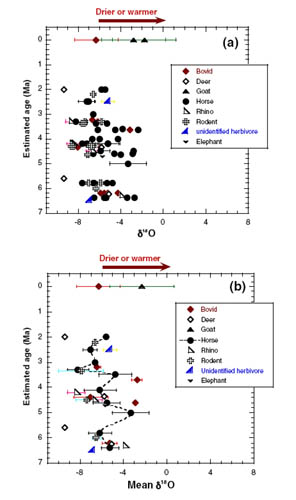 为了重建榆社盆地晚新生代植被和环境演变的历史,古脊椎所邓涛研究员课题组与美国同行合作,对采集自榆社盆地的不同食草哺乳动物类群,包括马科、犀科、牛科、啮齿目、鼠兔科的311件牙齿化石釉质样品的稳定碳氧同位素比值进行了分析,相关成果近期发表在国际刊物《古地理、古气候、古生态》(Palaeogeography, Palaeoclimatology, Palaeoecology, Vol. 440: 750-762)上。