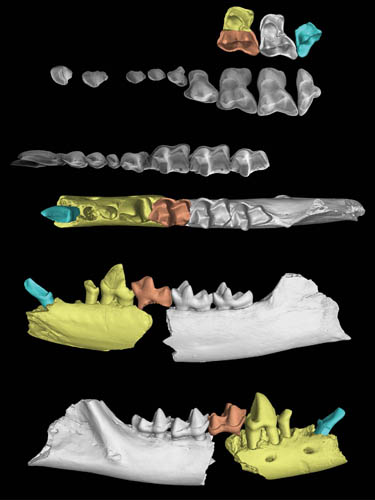 图1 麒麟树鼩(彩色)和笔尾树鼩(灰色)上、下齿列对比(倪喜军供图)