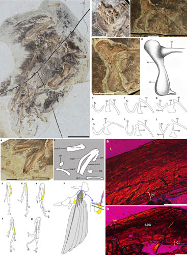图1 郑氏重明鸟正型标本,基干鸟类的肩带和手部骨骼的形态对比及重明鸟骨骼切片图(王敏供图)