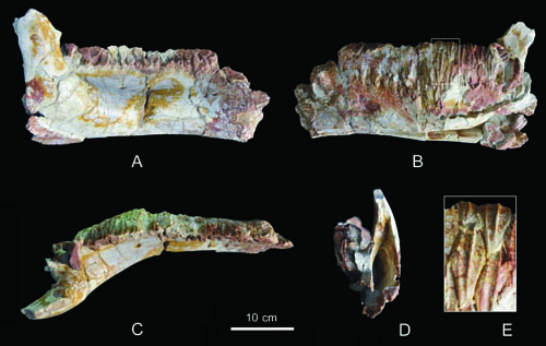 图1 天镇大同龙(Datonglong tianzhenensis)右齿骨外侧视(A)、内侧视(B)、背视(C)、尾视(D)和部分齿列放大图(E)。(尤海鲁供图)