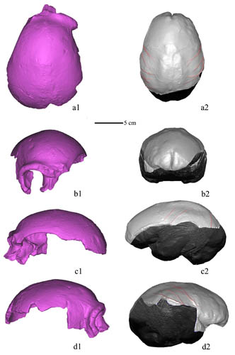 图1 马坝人头骨CT扫描虚拟复原的头骨(a1-d1)和颅内模(a2-d2),顶面观(a1-a2),前面观(b1-b2),左侧面观(c1-c2),右侧面观(d1-d2) (吴秀杰供图)
