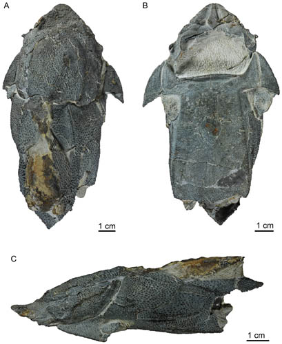 图1 长吻麒麟鱼正型标本(IVPP V20732)照片,背视图(A),腹视图(B),侧视图(C) (朱敏供图)