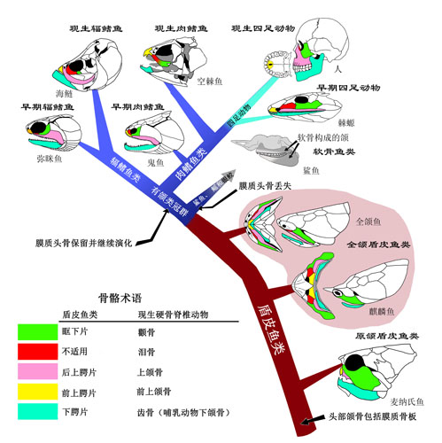 图4 简化的系统发育树,展示了膜质颌骨从盾皮鱼类原颌模式到硬骨鱼类全颌模式的演变序列。棕色身体剪影图代表无颌的有颌类干群(甲胄鱼类),绿色身体剪影图代表有颌的有颌类干群(盾皮鱼类),蓝色身体剪影图代表有颌类冠群。红色箭头指示口的位置,棕色箭头指示头与躯甲的分界。(朱敏供图)