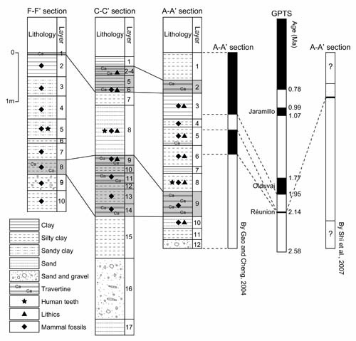 图1:龙骨洞遗址不同发掘剖面的地层对比及古地磁年代结果(李浩供图)