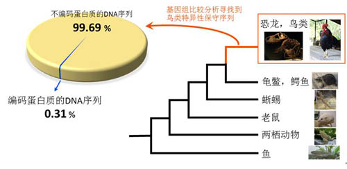 图2 鸟类在演化过程中几乎没有产生新的基因:通过比较48只鸟及9种其他动物的基因组,发现在鸟类特异保守的DNA序列中,几乎全是(99.69%)不编码蛋白质的。
