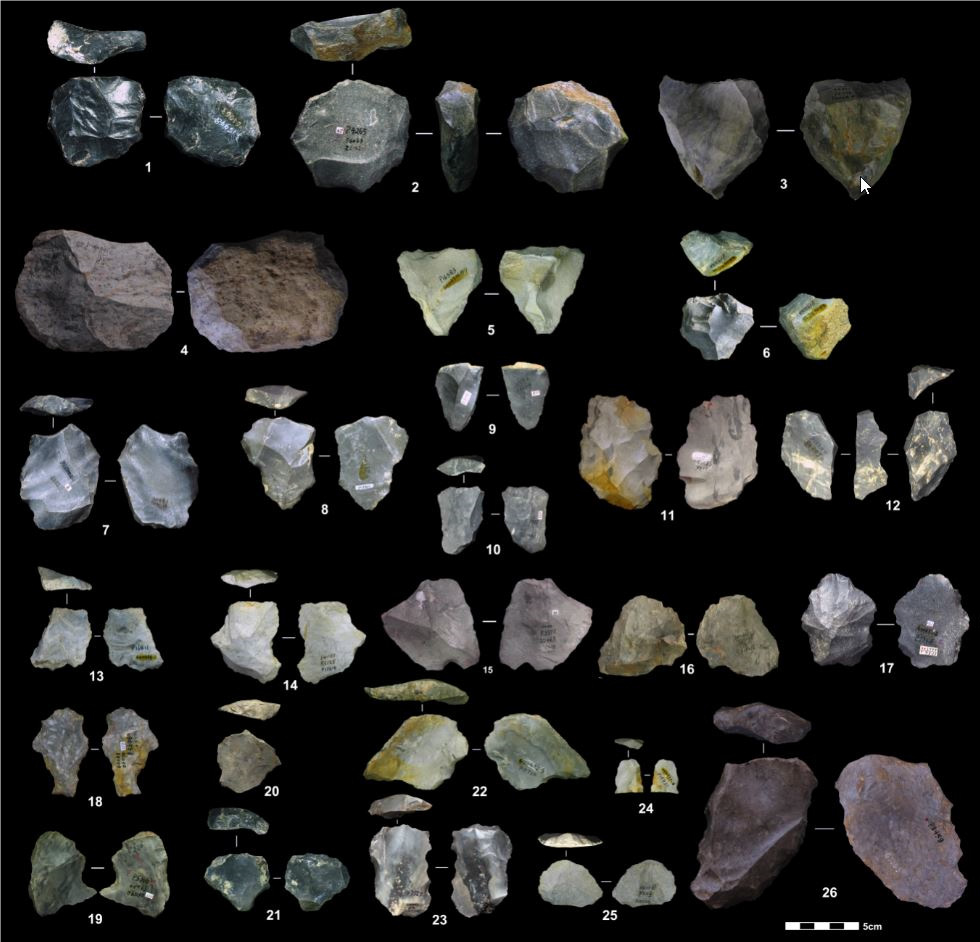 观音洞遗址出土石制品(勒瓦娄哇石核、石片、工具和修理台面石片) (胡越 供图)