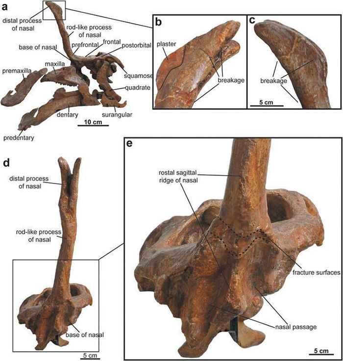 1 棘鼻青岛龙头骨,显示其特殊的“棘鼻”状头饰以及鼻骨根部断裂处