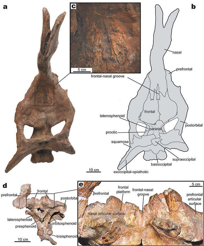 2 棘鼻青岛龙正型和副型头骨,显示鼻骨、额骨间的窄沟状结构