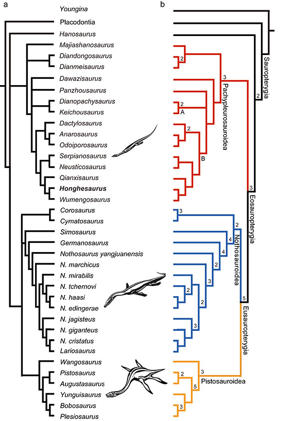 二叠纪末生物大绝灭之后,海洋生态系统在三叠纪发生了重大变革,爬行动物在海洋环境中辐射演化,形成以鱼龙类、海龙类和鳍龙类(包括楯齿龙类,肿肋龙类、幻龙类和蛇颈龙类)等为代表的海生爬行动物支系。华南三叠系海相地层分布广泛,保存有数量多、门类丰富的海生爬行动物化石,为研究当时海洋生态系统的构成、食物网和营养级提供了良好的条件。论文的合作者贵州大学博士生廖浚伶说,“红河龙与此前发现的乌蒙龙和黔西龙相似,但是它的牙齿外表面比较光滑、齿冠没有明显的膨大,与后两者显著不同,这可能反映了它们之间的食性差异”。
