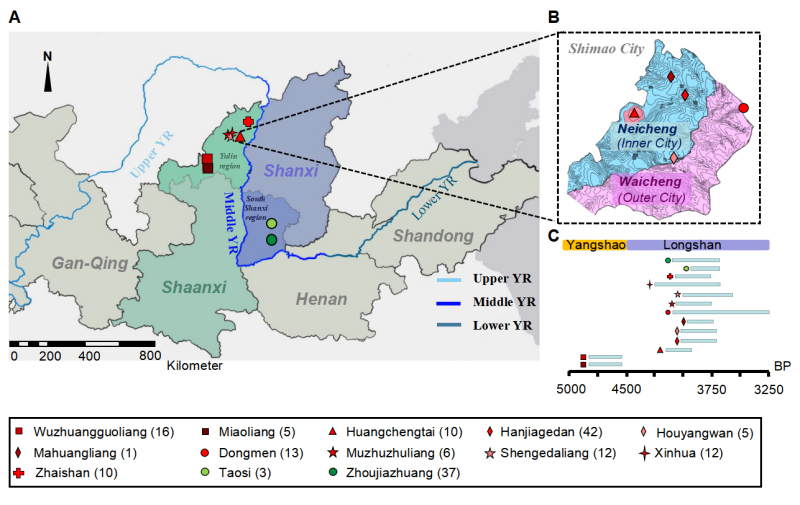 石峁遗址(又称“石峁城”),位于陕北地区榆林市神木市高家堡镇石峁村,距今约4300-3800年,是中国北方新石器时代晚期龙山时代最大的城址之一。石峁城内部主要包括中心皇城台、内城和外城三个部分,是具有政治中心和宗教中心双重性质的都邑性城址,并且越靠近皇城台,等级越高。在陕北地区内部,石峁城周围的其他龙山时代遗址(如木柱柱梁遗址、神圪垯梁遗址、新华遗址和寨山遗址等)也与石峁城具有相似的文化,被称为“石峁文化”。由于石峁城以及石峁文化的重要性,石峁居民来源的相关研究成为学者们长期关注的热点。此外,与石峁遗址隔黄河相望,位于山西省南部(以下称“晋南”)龙山时代的另一重要遗址——陶寺遗址,与石峁遗址在文化上也呈现出诸多相似性,但两文化人群之间的遗传联系仍不清楚。因此,人群演化研究成为解决这些问题的有效手段。