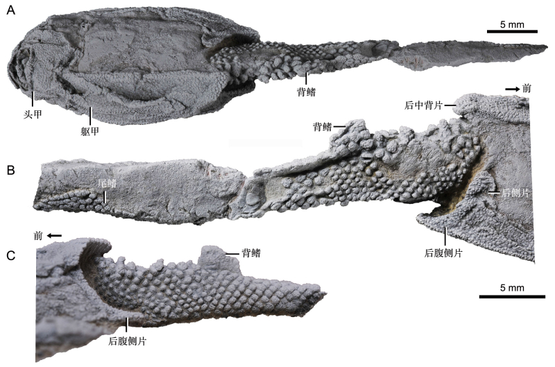 胴甲鱼类是盾皮鱼类最原始的分支,处于有颌脊椎动物演化的根部,是一类外形非常奇特的鱼类。它们两眼和鼻子挤在头顶的一个“天窗”内,躯体前半部分被箱形膜质骨甲所覆盖,特别是一对胸鳍也被坚硬的骨片包裹,比起鱼鳍,看上去更像节肢动物的附肢。