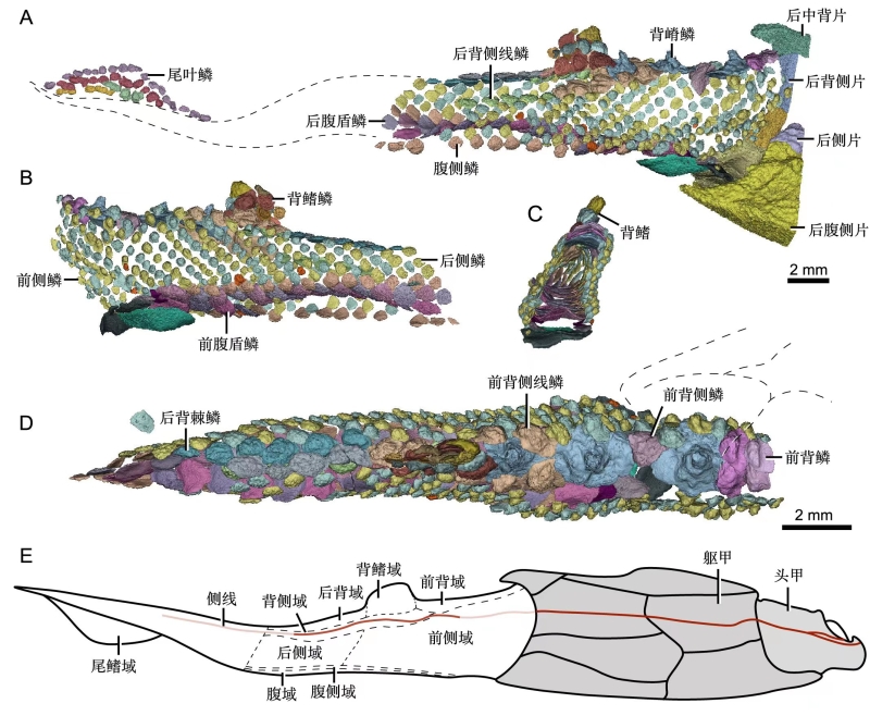 胴甲鱼类是最早为科学界所知的古生物类群之一,但早期研究主要集中在中、晚泥盆世较为特化的属种上。上世纪下半叶开始,我国发现的云南鱼类等原始胴甲鱼类掀起了胴甲鱼类研究新的热潮,但直到90年代才发现了保存完整的云南鱼类标本——西屯副云南鱼(Parayunnanolepis xitunensis),至今副云南鱼仍然是云南鱼类中保存最完好的属种。因其原始地位和完整性,副云南鱼成为揭示早期有颌脊椎动物性状演化序列的关键一环。研究团队使用高精度计算机断层扫描(MicroCT)技术,对西屯副云南鱼正模保存的鳞列进行了详细重建,获得迄今最完整的胴甲鱼高清鳞列及鳞片三维形态。