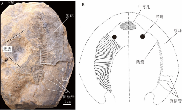 此次发现的东方鱼化石仅保存了头甲左侧的部分腹环,但这已经是中泥盆世保存最好的盔甲鱼标本了。新标本头甲较圆,但是只保存了一半,有点像中国古代只露出一半的琵琶。新标本虽然不完整,但是具有多鳃鱼类的典型特征,即具有较多数目的鳃囊(鳃区至少保存了37对鳃囊),但根据腹环长度和每个鳃囊宽度推算,它应该跟硕大东方鱼一样,拥有多达45对鳃囊。除此以外,该标本保存的部分指示其腹环宽而长,是个体较大的多鳃鱼类,眶孔大而圆,至少具有3对侧横管,头甲纹饰为细小致密的粒状突起,这些特征尤其是鳃囊数目指示其应归属于东方鱼属(图4A)。相比之下,宽甲鱼的腹环较宽,但呈前端尖后端宽的不均匀分布,鳃囊为18对(图4B);而多鳃鱼的腹环比东方鱼的腹环更窄,仅具12对鳃囊(图4C)。至于该标本是否代表了东方鱼的一个新物种,由于标本没有保存鼻孔、眶孔等关键信息,因次研究团队暂时没有命名新物种,而是把它看作东方鱼属的一个待定种,有待未来的野外有新的发现,进一步研究来确定。