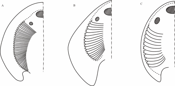 图4 东方鱼(A)、宽甲鱼(B)和多鳃鱼(C)鳃囊对比图(郭肖聪绘)