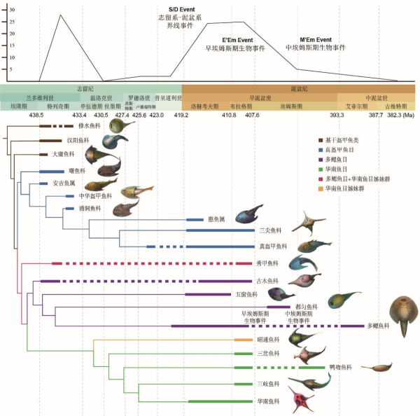 图5 盔甲鱼类的系统发育关系、属级多样性以及对泥盆纪生物事件的响应