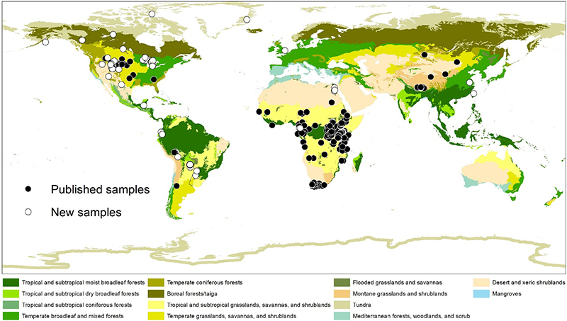 图1. 偶蹄目牙釉质样品的地理分布。样品数量=1366。
