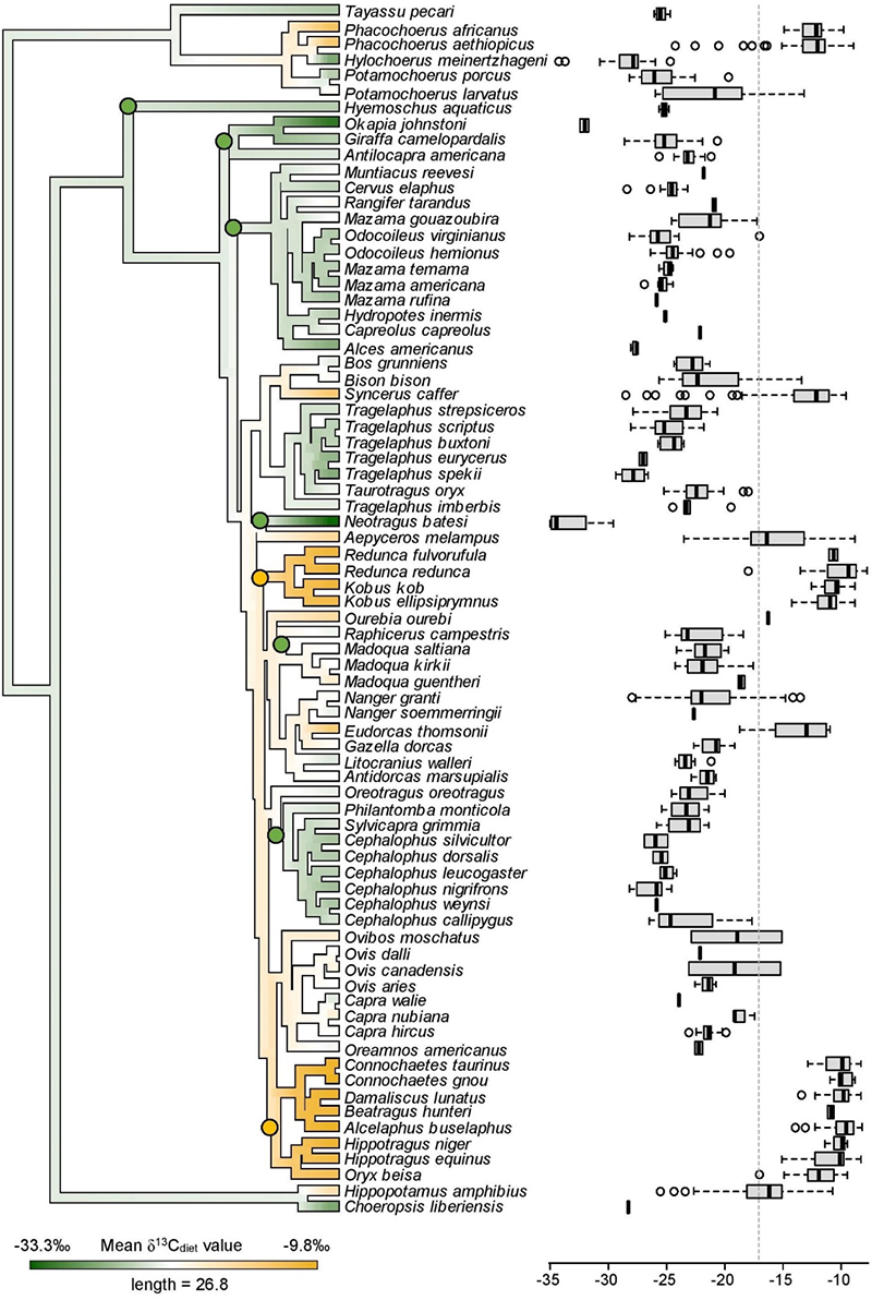 图2. 偶蹄目动物碳同位素数值在系统发育树上的分布(左)及箱型图(右)。物种数量=79。
