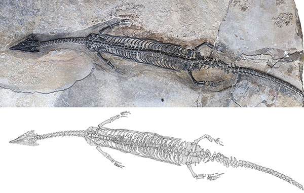 尖嘴长吻的“四脚蛇”化石,全长超过半米。中科院古脊椎动物与古人类研究所科研人员在云南省罗平县中三叠世海相地层(2.44亿年前)发现一种新的肿肋龙科爬行动物,代表了多指节型鳍龙类最早出现的化石记录,将其命名为“奇异罗平龙”。相关成果近日发表在国际学术期刊《科学报告》上。