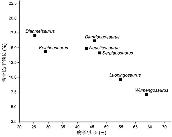 图4,肿肋龙类吻长-头长与舌骨-下颌长度比值对应关系(徐光辉供图)