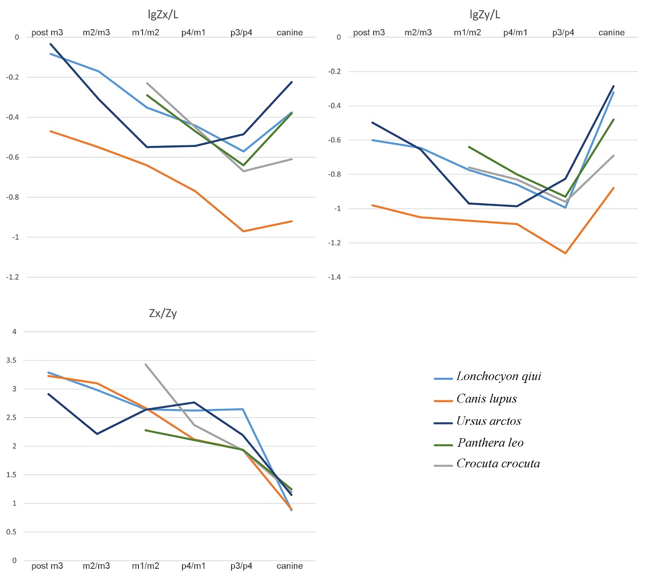 图3:邱氏矛犬熊与灰狼、棕熊、狮、鬣狗下颌受力情况对比图