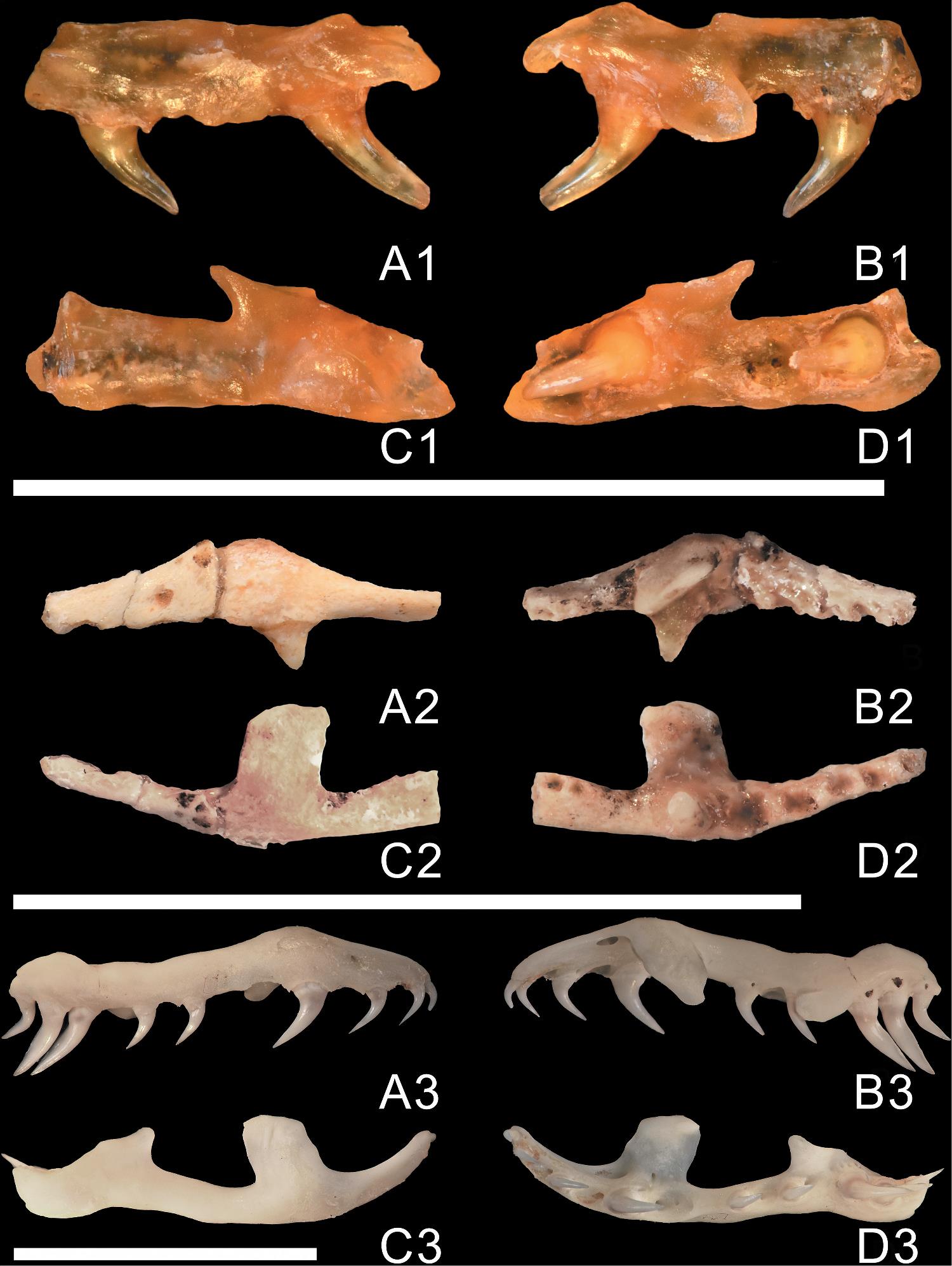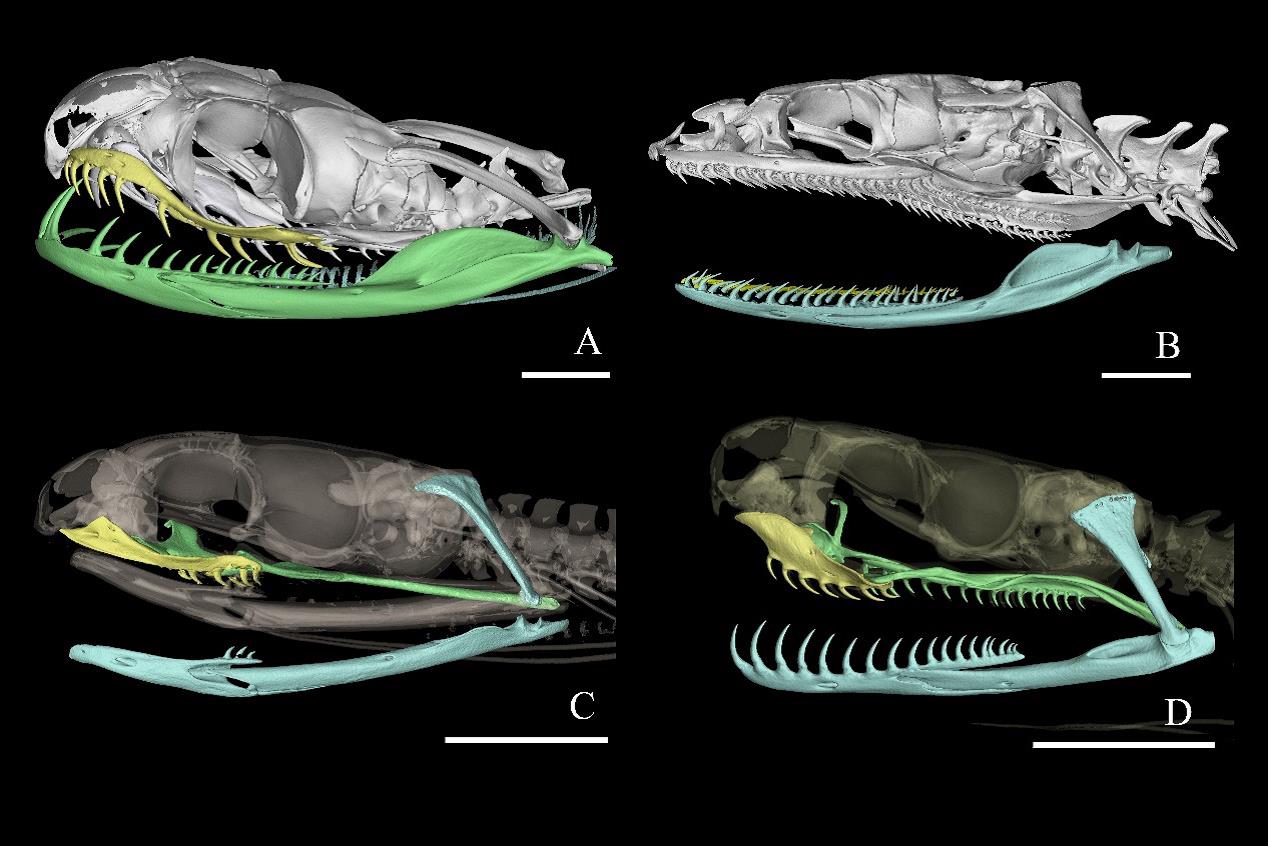 图1 几种不同食性的蛇类的牙齿(A鸟类 B 鱼类 C 鸟蛋 D 蜗牛)