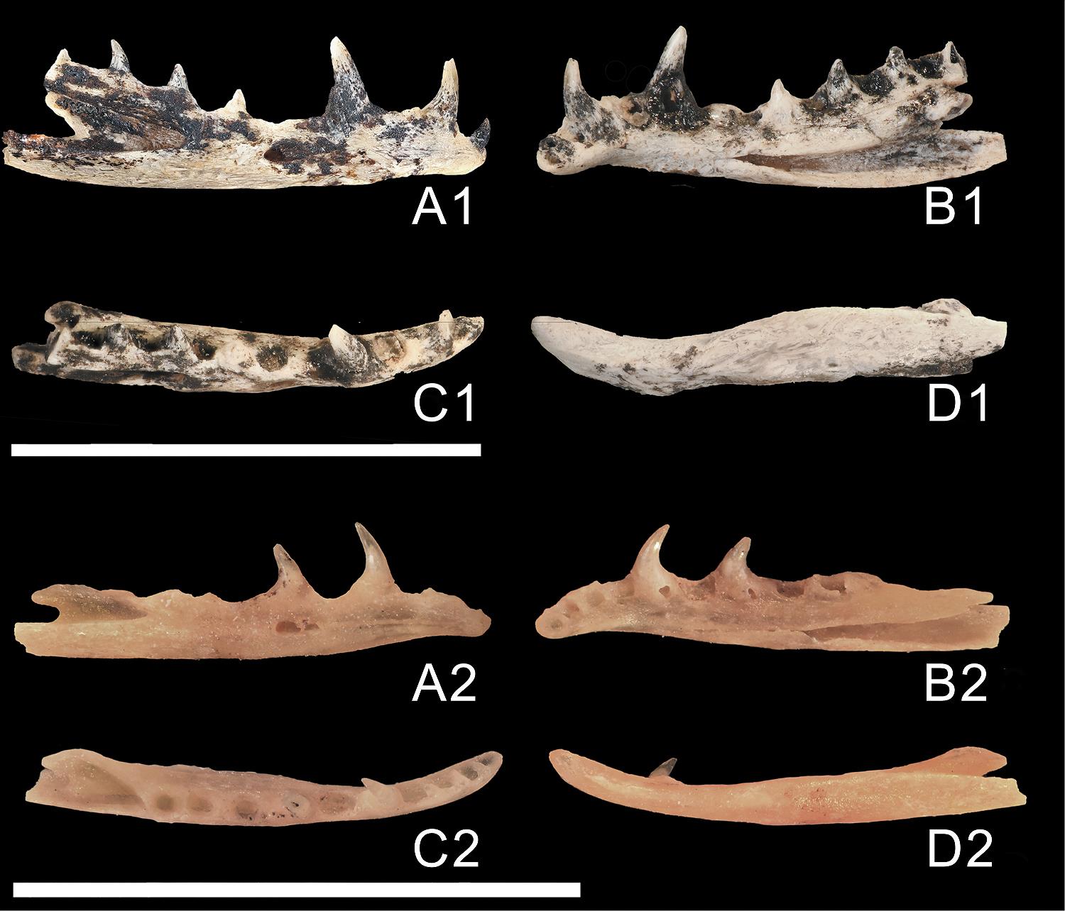 为人们所忽略的是,在确山裂隙堆积中筛洗出的化石残片中,还有很多与小型哺乳动物共同埋藏的两栖、爬行动物化石。在QS0401和QS0402两个相近层位的裂隙中,存有大量两栖、爬行动物零散化石。其中,一些蛇类的零碎头骨和头后骨骼引起了研究人员的注意。这些蛇类化石不仅数量庞大,而且多样性十分丰富,很多化石材料中保存了带有不同类型牙齿。