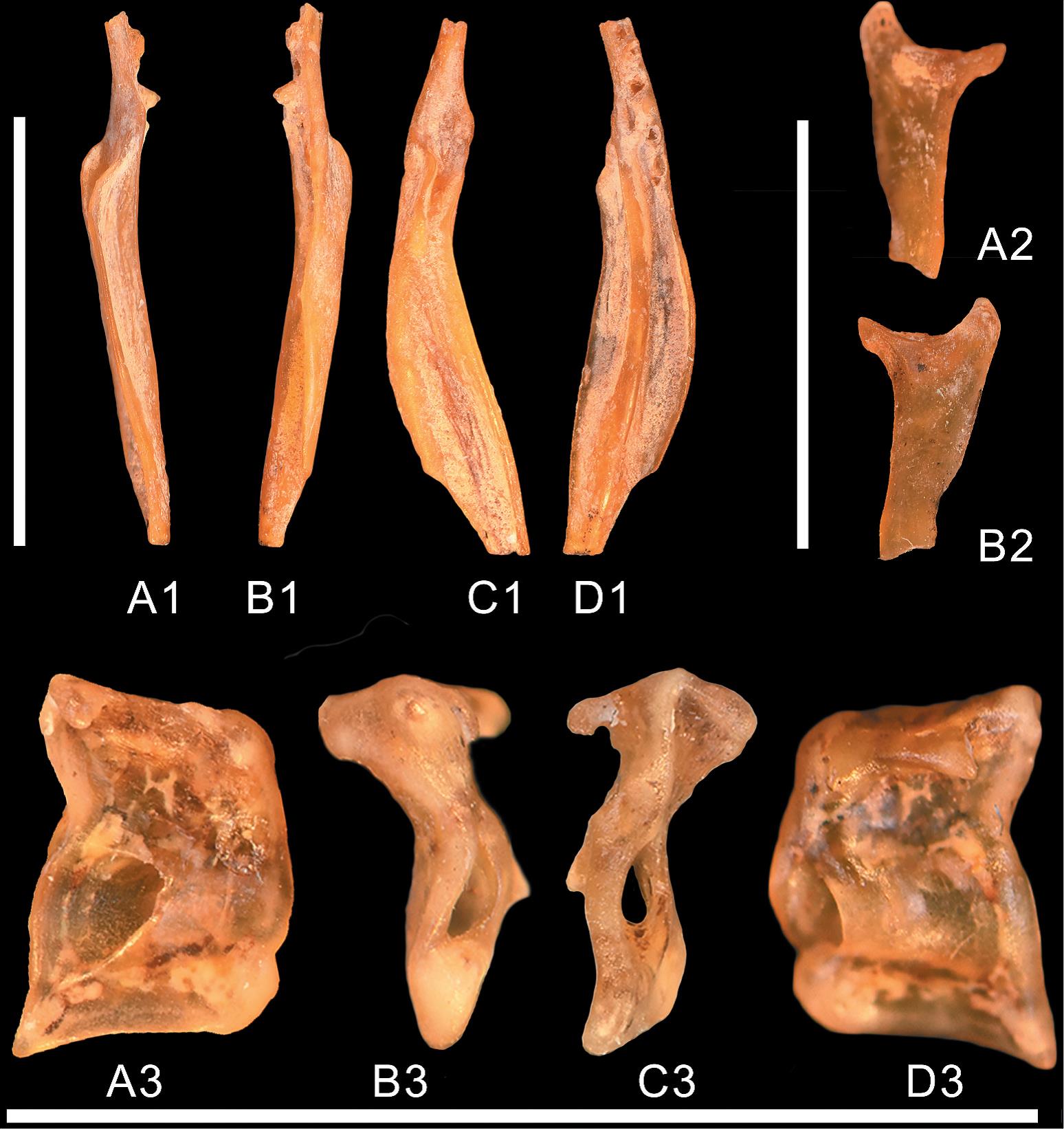 图4 河南确山蝮亚科头骨化石材料(翼骨、外翼骨和前额骨)