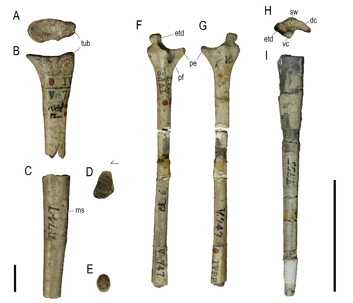 A&B,第二翼指骨(IVPP V 746);C-E,胫跗骨(IVPP V 747);F-H,第一翼指骨(IVPP V 747);I,胫跗骨(IVPP V 755);左侧比例尺为10 mm,适用于A-E;右侧比例尺为50 mm,适用于F-I