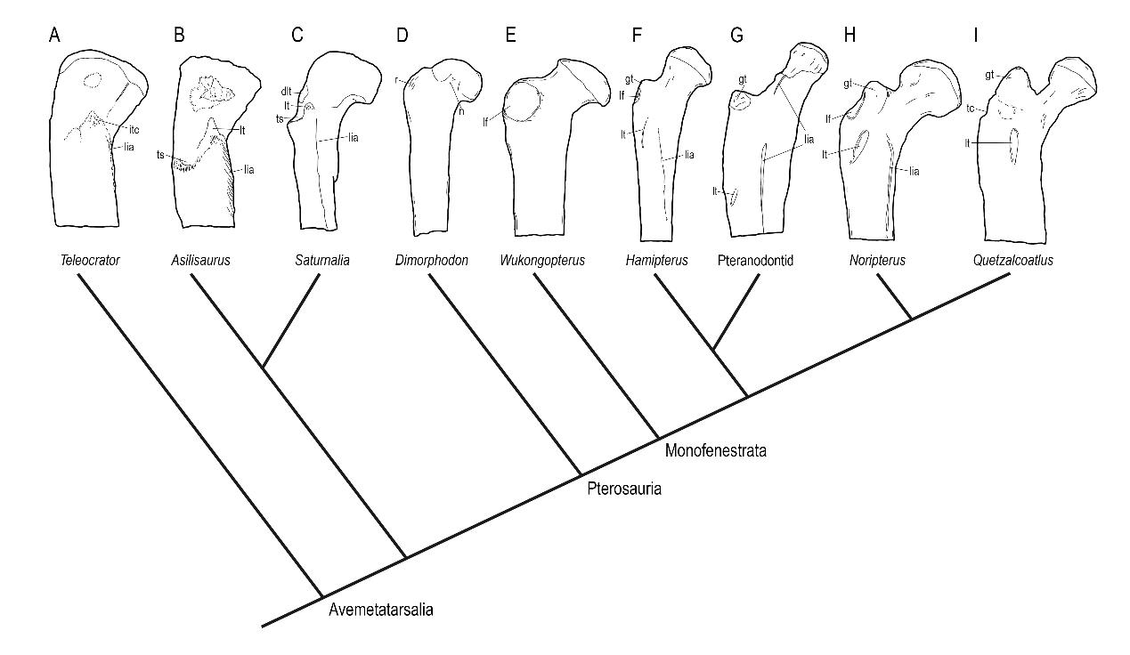 除了分类学研究外,研究人员还重点将这批材料中的翼龙股骨与其他主龙类的股骨进行了详细的比较,利用括号法建立了翼龙股骨上的一些结构与大腿肌肉附着的联系,这些肌肉包括了耻坐股内肌1和2、髂股外肌和髂转子尾肌、股胫内肌和股胫外肌、尾股长肌和尾股短肌、股收肌1和2、坐骨转子肌和耻坐股外肌,并讨论了它们在翼龙类群中的演化。以往研究认为翼手龙类股骨近端外侧的突嵴(在翼龙文献中常称“大转子”)与其他鸟跖类的小转子同源。这次研究发现,在和翼龙关系较近的基干鸟跖类中,都存在一条明显的肌嵴发源自小转子。在现生鸟类中的这条肌嵴通往转子间嵴,而鸟类的转子间嵴通常被认为在演化中是由小转子向近端迁移与大转子愈合形成的。若翼手龙类的“大转子”确与其他鸟跖类的小转子同源,则这条肌嵴的近端也应当与前者相接。然而,这并未得到化石材料的支持,在绝大多数可供研究的翼手龙类股骨中,该肌嵴都通向近端前外侧的一小结节。因此,这次研究否定了之前的假说,并建立了翼龙股骨近端前外侧的小结节与其他鸟跖类小转子的同源关系。