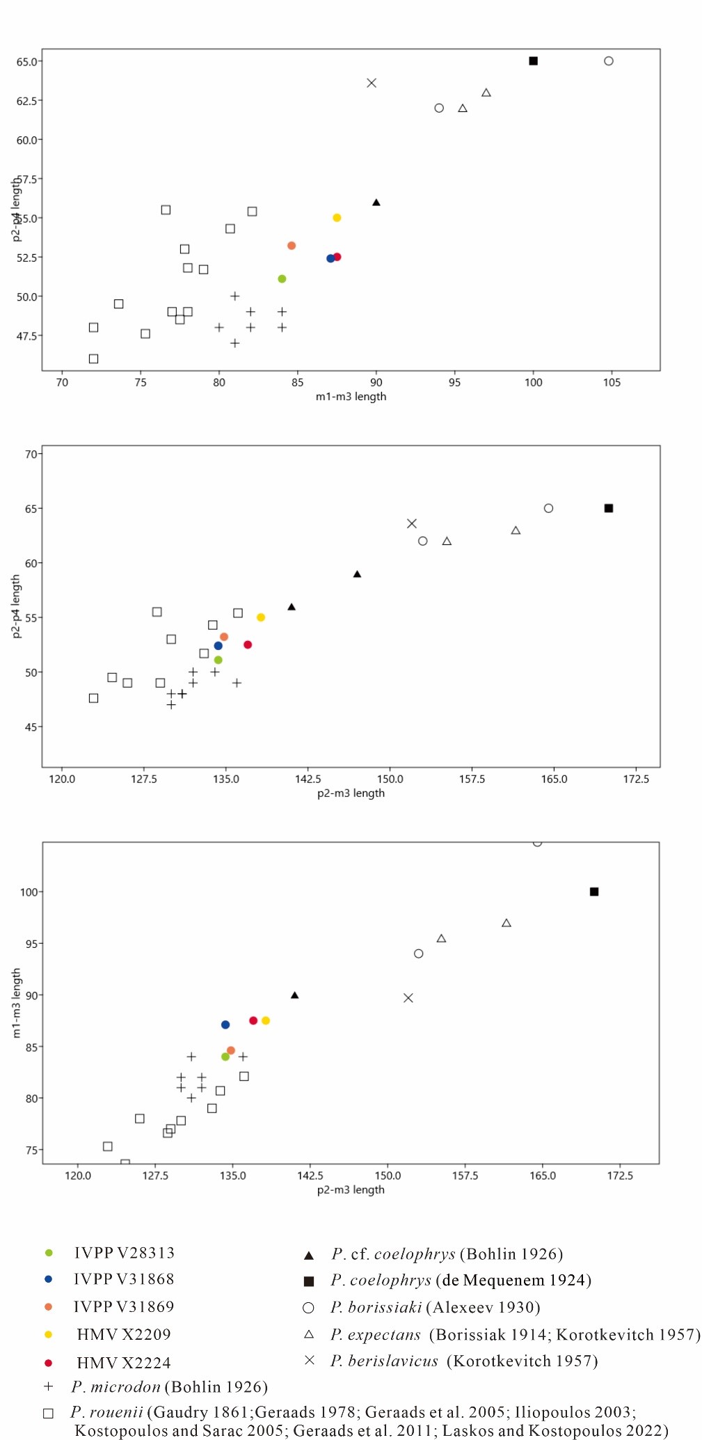 腔额古麟相似种(P. cf. coelophrys)和小齿古麟(P. microdon)是中国常见的两种代表性古麟,两者主要以大小区分;此外还存在一些头骨和头后骨骼特征的差异,下颌材料缺少明确的鉴定特征。临夏盆地晚中新世柳树组地层中发现的六件古麟下颌骨大小介于腔额古麟相似种和小齿古麟之间,显示两种古麟的个体大小具有连续变化的特征,此外,两种的整体差异在现生长颈鹿的变异范围内。在形态特征上,中国的古麟化石第三和第四下前臼齿特征也呈现出连续变化的模式,但未显示与个体大小有明显的相关性。因此,从下颌特征来看,腔额古麟相似种和小齿古麟无法区分。