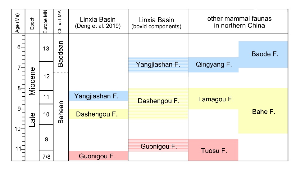 由于临夏盆地晚中新世的化石牛科动物数量较多,使得我们可以将其与中国北方其它地区的化石牛科动物进行生物地层学对比。青海柴达木盆地的托素动物群与临夏盆地的郭泥沟动物群年代相近,二者都有柴达木兽化石发现,但前者的化石牛科动物多样性更高。临夏盆地大深沟动物群的牛科动物在中国北方有着较为广泛的分布,与之相似的有陕西府谷的喇嘛沟动物群,以及陕西蓝田的灞河动物群。喇嘛沟动物群与灞河动物群在牛科动物的组成上差异较大,而大深沟动物群的牛科动物似乎是二者的结合,或许代表了较长的时代分布。临夏盆地杨家山动物群的牛科动物组成与甘肃庆阳动物群和山西保德动物群相近,特别是中华羚、粗壮羚、古大羚等大型羊族动物的出现,表明杨家山动物群的在时代上很可能与后二者有所重叠。