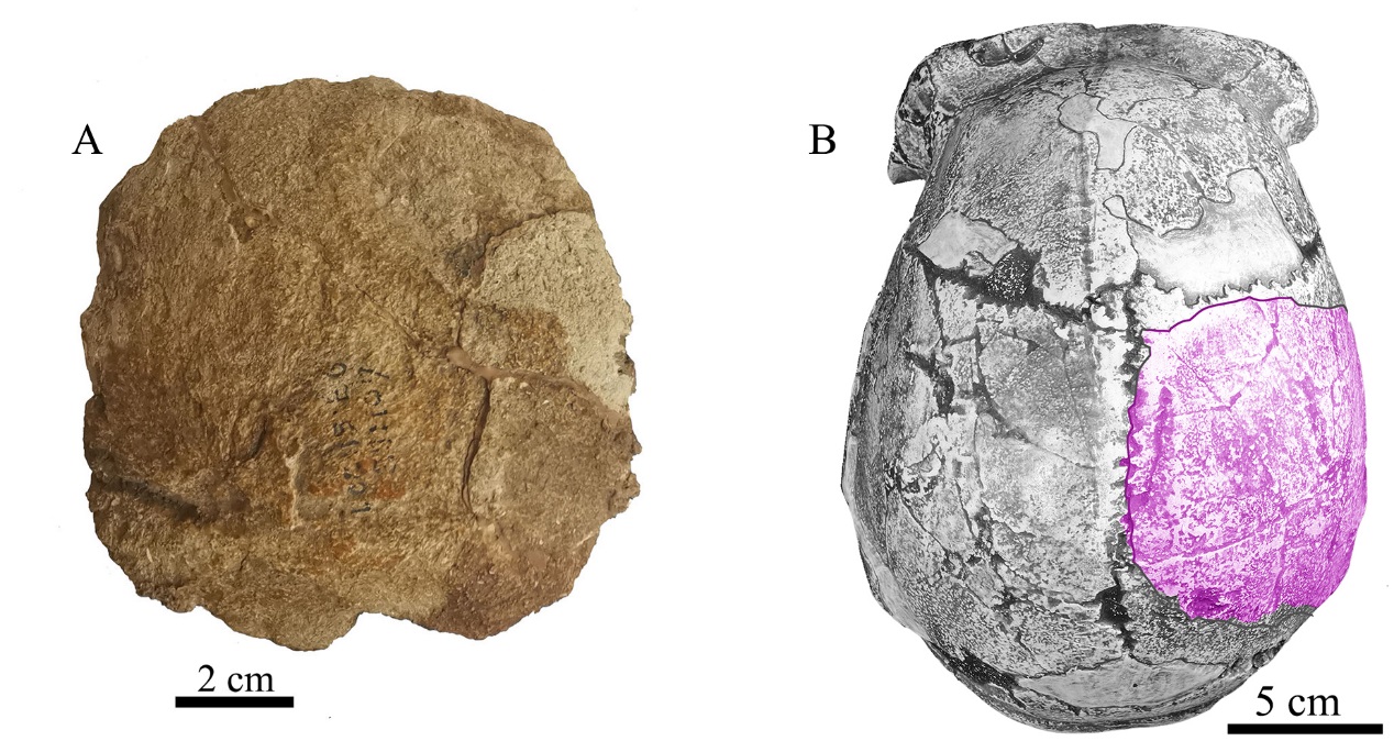左侧:顶骨化石外侧面观;右侧:周口店直立人头盖骨模型顶面观,示顶骨化石位置