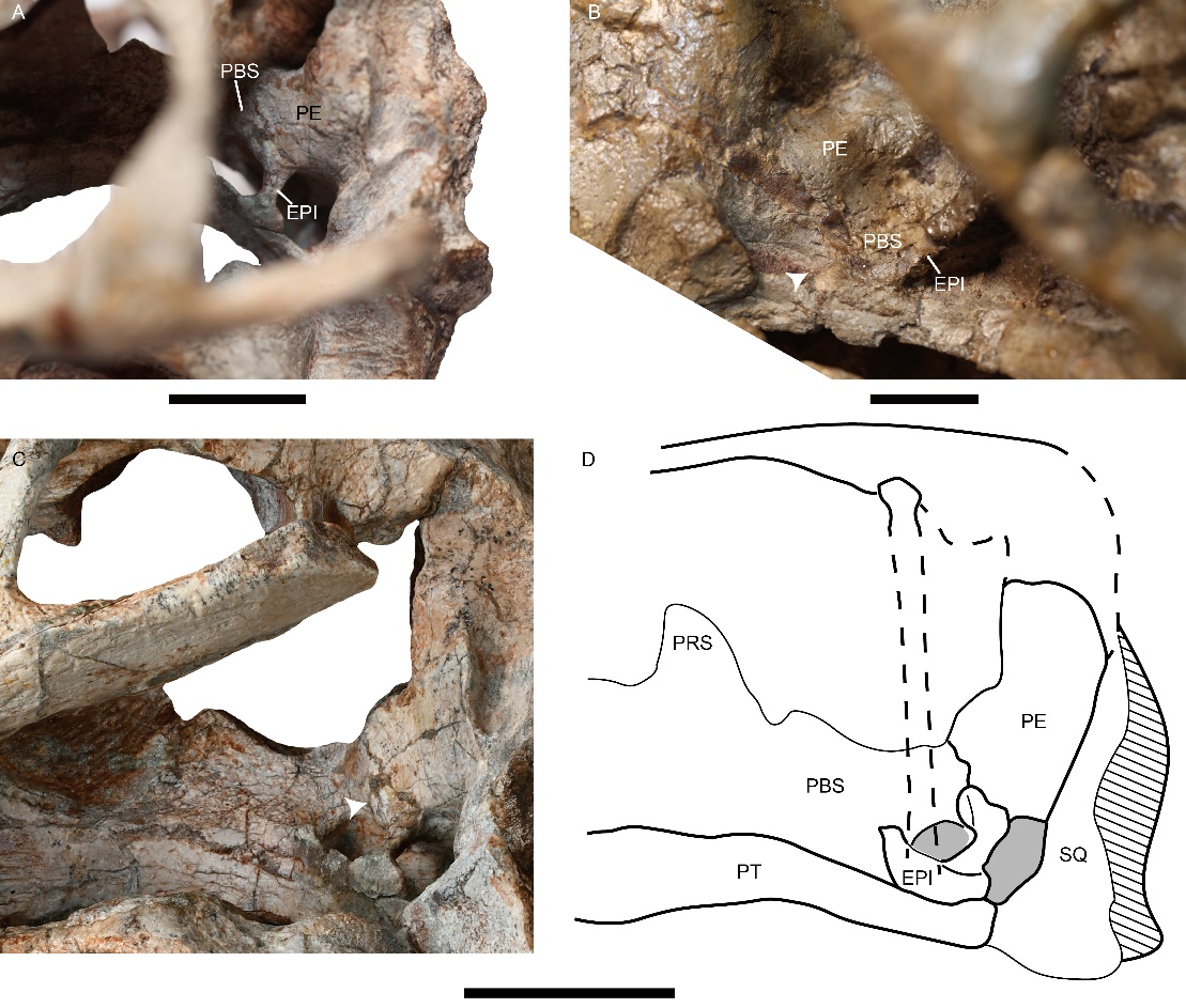 在其中一件保存较好的标本上,其上翼骨的基部后缘向内侧延伸,形成一个与脑匣侧壁相接触的骨棒,这种上翼骨形态从未在其他二齿兽中报道过,而在重新检查新疆种的正型标本后确认这是吉木萨尔兽属的自有衍征。经过与多种兽孔类对比后,推测这一结构具有稳定腭部复合体的功能,并可能以软骨连接的形式广泛存在于二齿兽类各类群中。