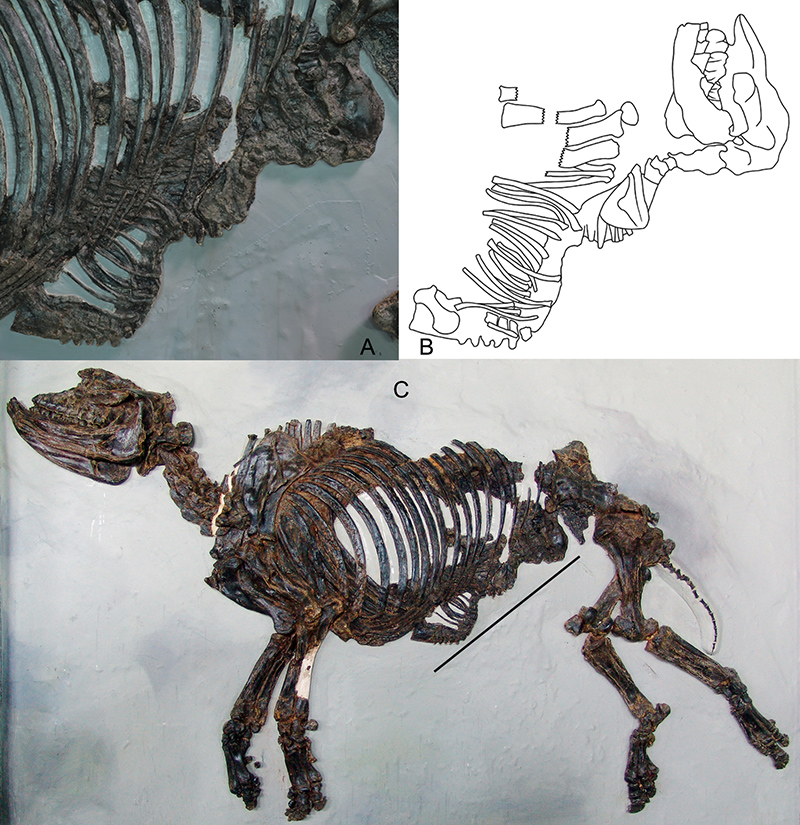 图1 产于山东山旺盆地早中新世地层的妊娠期细近无角犀骨架