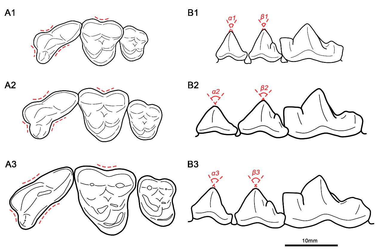 图2 不同貉上(A)下(B)牙齿的比较 (姜皓绘制)1.现生N. proccyonoides; 2.裴氏貉;3.中华貉