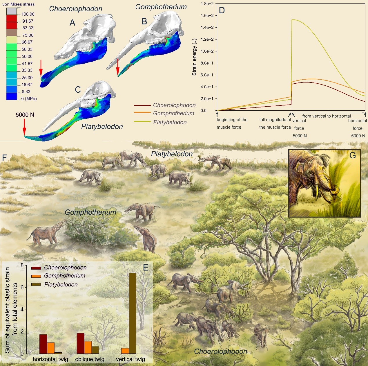 为了深入揭示三种象类的食性和取食方式,研究团队采用了多种研究手段,其中牙釉质碳氧稳定同位素分析和有限元力学分析成为重建这些早期象类的取食行为的关键手段:牙釉质碳氧稳定同位素提供了三种象类不同食性偏好的证据;有限元力学分析则成为恢复取食方式的关键手段。