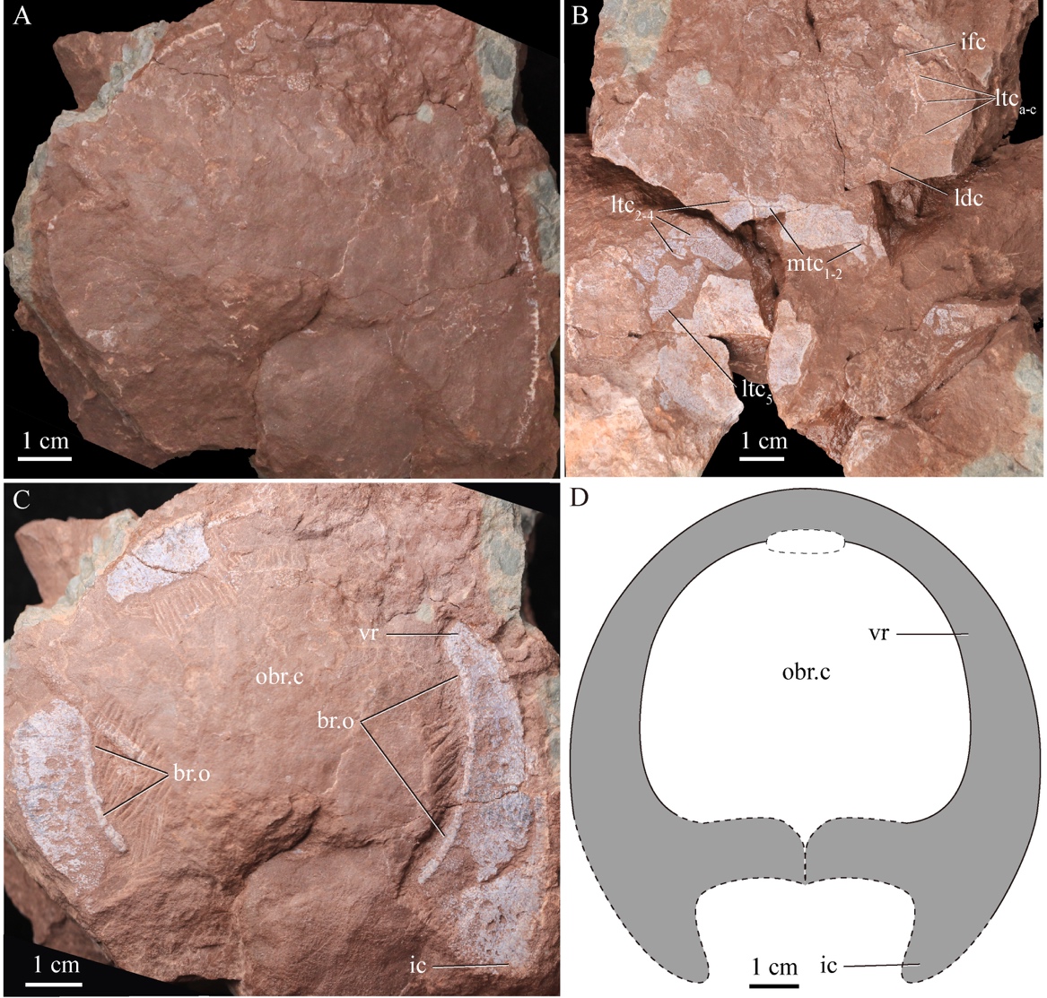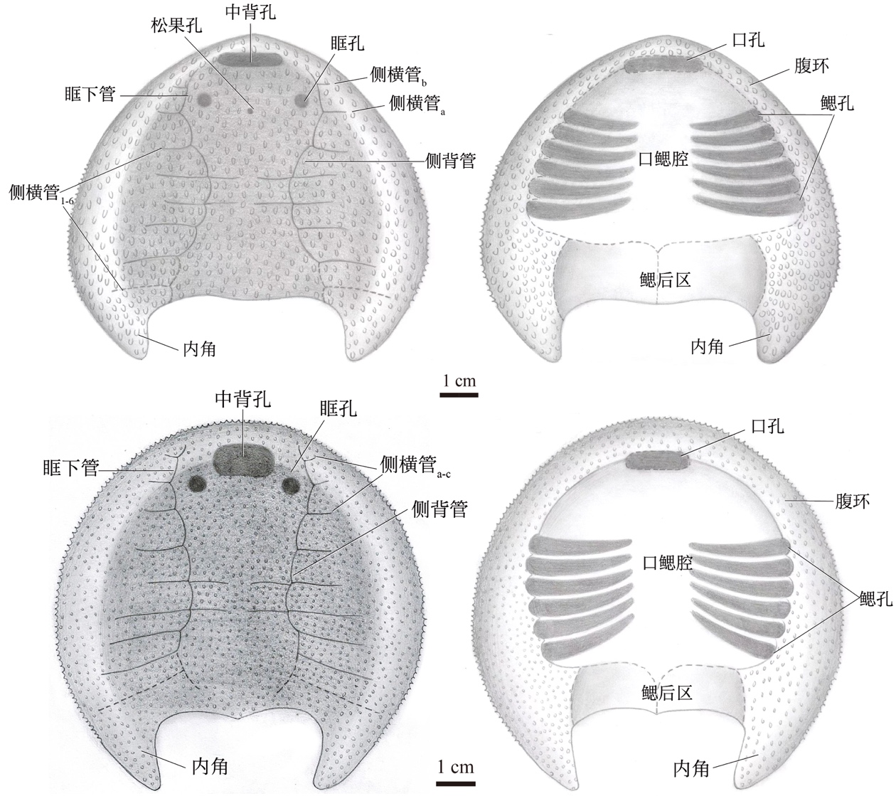 西域鱼在系统分类上属于盔甲鱼亚纲修水鱼科,属于盔甲鱼类早期最原始的三大类群之一。西域鱼化石最早由中国地质博物馆卢立伍研究员研究,并于2007年发表在《地球科学》杂志上。然而,由于该种建立时所依据的模式标本头甲后缘大部分缺失,以至于关乎其系统位置的头甲形状不能确定,因此卢立伍研究员最初将该种归于汉阳鱼科的南疆鱼属(Nanjiangaspis),命名为“张氏南疆鱼”。2015年,刘玉海先生等在编写《中国古脊椎动物志 无颌类》有关盔甲鱼亚纲部分的过程中对该种的现有标本进行了重新观察,发现该种头甲纹饰是由细小粒状突起组成,而南疆鱼属的纹饰不仅大,而且呈雪花状,由于这方面的显著不同,因而又被归入纹饰同样为粒状突起的柯坪鱼属(Kalpinolepis),但仍属汉阳鱼科。2018年9 月,盖志琨研究员课题组针对新疆柯坪地区的志留系红色岩系又组织了一次新的野外考察,并采获一批盔甲鱼类的新材料,并报道了在这一地区发现的最古老的多鳃鱼类锯齿宽腹鱼(Platylomaspis serratus)。2019年,刘玉海先生等通过西域鱼的新材料的研究,意外发现张氏西域鱼的头甲呈椭圆形,而非之前认为的梯形,这一发现对于确定西域鱼的系统分类位置至关重要。汉阳鱼科和修水鱼科二者的关键区别在于前者头甲呈前窄后宽的梯形,后者头甲呈竖置的卵圆形。因此,新材料卵圆形头甲的发现,说明该种无疑应归属修水鱼科。 因此,刘玉海等为其建立了一个新属——西域鱼属(Xiyuaspis),“张氏柯坪鱼”亦应被称为张氏西域鱼。至此,张氏西域鱼的归属和系统位置得以确立。然而,西域鱼名字的故事,并未就此结束。 2021年,中国地质大学的纵瑞文副教授来信,提醒作者西域鱼属名拉丁文Xiyuaspis在盔甲鱼类和三叶虫中为异物同名。经查阅有关资料,Xiyuaspis在被用作志留纪早期一盔甲鱼类属名之前,张太荣等在1985年已将其用作奥陶纪三叶虫的一个属名。因此,此次研究建议以新属名Xiyuichthys代替Xiyuaspis。在过去近20年的研究中,西域鱼四易其名,足见其身世坎坷。 2021~2023年, 在国家自然科学基金的支持下,盖志琨研究员带领团队,先后多次赴新疆塔里木盆地进行野外调查,特别是在疫情期间,更是克服重重困难,完成了三次大规模的野外挖掘,最终取得了突破性进展,在塔里木盆地的柯坪县大湾沟和克尔买提村剖面的塔塔埃尔塔格组采获大量完整的盔甲鱼类化石。此次研究团队报道了在新疆柯坪县克尔买提的塔塔埃尔塔格组发现的张氏西域鱼新材料,新材料不仅再一次证实张氏西域鱼头甲为椭圆形,更重要的是,新材料完整保存了张氏西域鱼的腹环,补充了该种的头甲腹面特征,让我们对该种的形态学信息有了更加全面地了解(图2)。研究发现,张氏西域鱼的腹环前部宽度变化不大,仅在头甲后侧方才明显变宽并构成角的基部。腹环中央包裹着口鳃窗,口鳃窗几乎呈圆形。