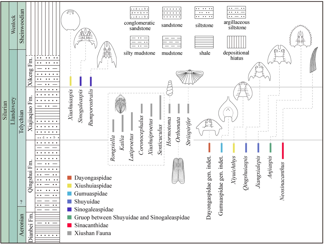 澧溪西域鱼在江西地区的发现将西域鱼属的古地理分布从志留纪时期的塔里木板块扩大至华南板块。江西西北部的志留纪含鱼地层主要包括清水组和西坑组,两组因均发育一套独特的紫红色碎屑岩而被称为志留纪下红层和上红层。清水组和西坑组中的鱼类化石组合各具特色,前者以盔甲鱼类中的大庸鱼科、修水鱼科、曙鱼科、古木鱼科以及棘鱼类中的中华棘鱼科的共同出现为标志,属于温塘鱼类化石组合;后者则以盔甲鱼类中修水鱼科和中华盔甲鱼科成员的共同出现为标志,属于茅山鱼类化石组合。尽管修水鱼科具有更长的地层延限,从志留系下红层向上延限至上红层,但该科成员在不同的层位显示出不同的组成面貌。其中,西域鱼属和长兴鱼属仅出现在志留系下红层(清水组、唐家坞组和塔塔埃尔塔格组), 修水鱼属则仅出现在志留系上红层(西坑组)。因此,江西九江地区下红层清水组与上红层西坑组的鱼类组合面貌截然不同,分别代表了盔甲鱼类两个不同的演化阶段,从而为华南志留纪上、下红层的精确对比提供了参考标尺。西坑组和清水组中间被富含秀山动物群的夏家桥组分隔开,秀山动物群是一个包括三叶虫、双壳类、腕足类、头足类和腹足类等壳相化石的近岸浅水生物群,也是扬子区特列奇中期海平面上升事件的鲜明标志。秀山动物群将温塘组合和茅山组合的时代分别限定在特列奇期早期和中晚期。因此,江西九江地区志留系特列奇阶生物地层序列较为完整,可以为华南和塔里木板块志留纪特列奇阶的生物地层对比提供参照。将该地区的生物地层序列作为对比标准的优势在于,江西地区清水组中的很多鱼化石可以与其他地区的鱼化石进行种一级的对比。例如,清水组中的刺猬安吉鱼和发现于浙江安吉唐家坞组中的网状安吉鱼可以直接进行对比,对确定产曙鱼的唐家坞组属于志留系下红层而不是之前认为的上红层起了至关重要的作用;九江江夏鱼则可与湖北武汉的后棘江夏鱼直接对比,表明武汉地区的含鱼地层可与江西武宁下红层清水组对比。最近,戎氏江夏鱼在新疆柯坪塔塔埃尔塔格组的发现,将塔里木板块和华南板块之间志留系特列奇阶下部海相红层的对比精确到种一级水平,而西域鱼在江西九江和新疆柯坪地区的同时发现,则为这一对比进一步提供了种一级化石证据。