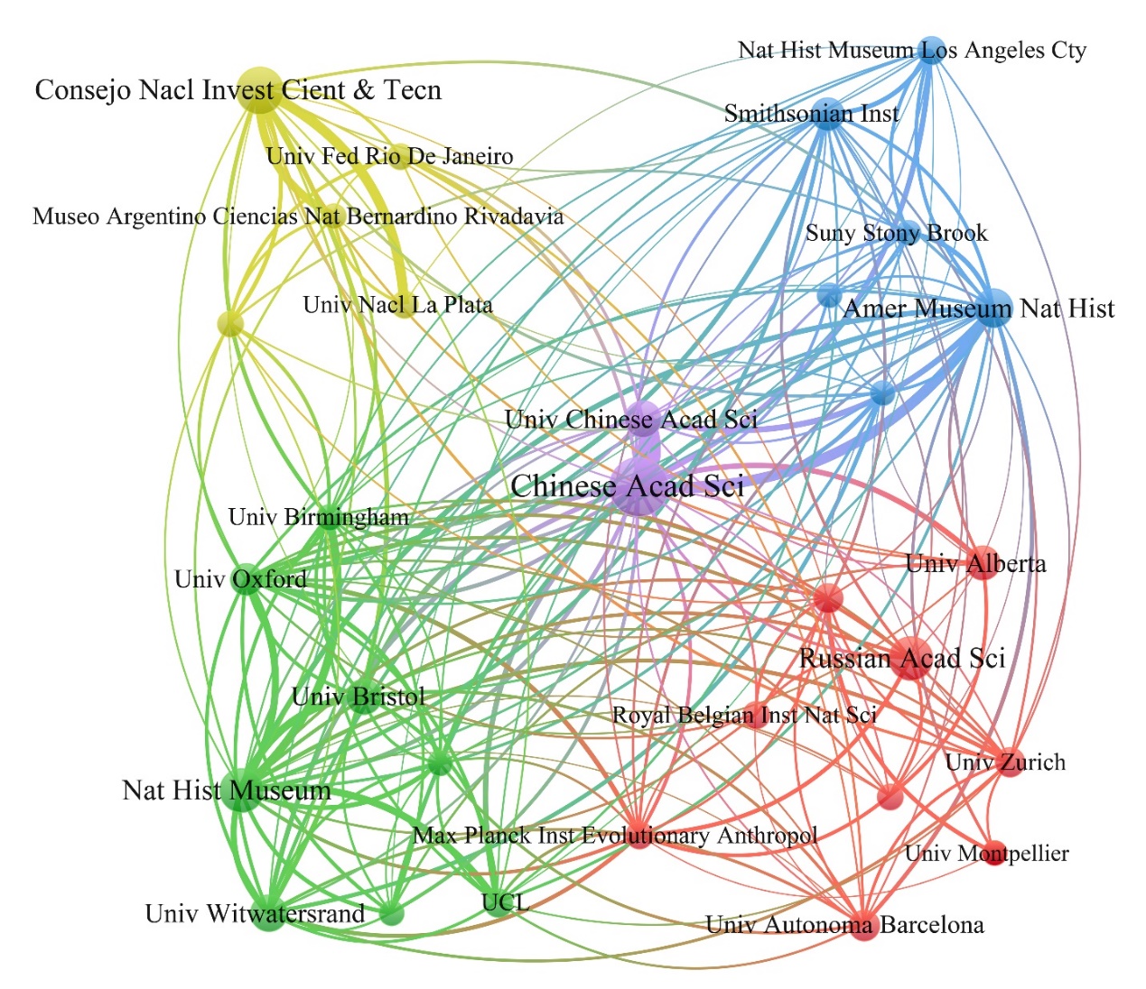 图1 对古脊椎动物学贡献最大的前30家机构及其合作网络关系
