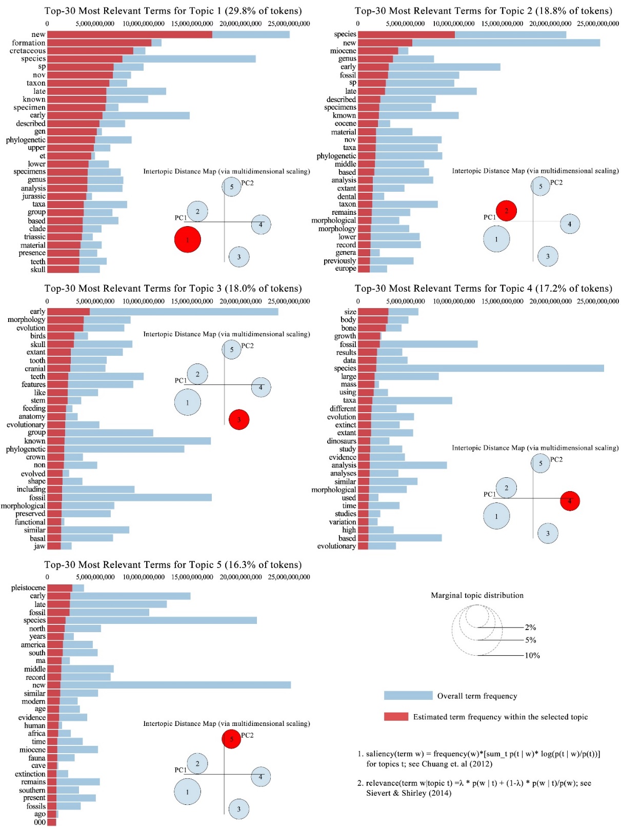 过去的十年间,古脊椎动物学研究主要发表在302种期刊或专著上,Journal of Vertebrate Paleontology排名第一,PeerJ和Historical Biology次之。发文数量排名前十的期刊中,2022年的平均影响因子为2.66,平均引用半衰期为7.43。在这些研究中最常见的关键词是“evolution”、“phylogeny”和“origin”等,这些关键词的普遍存在,突显了该领域的研究特点。同时,“morphology”和“anatomy”等常用术语揭示了比较解剖学仍是古脊椎动物学的核心。文中的关键词聚类网络揭示了13个主要聚类,突出了古脊椎动物研究的热点研究主题。为了进一步揭示热点研究主体,研究者通过隐含狄利克雷分布分析(Latent Dirichlet Allocation)对文章的摘要内容进行建模,根据摘要中词的共现信息推断出主题的分布和各个主题下词的分布,进而揭示其中的潜在主题结构。该分析识别出“Cretaceous Period Dinosauria and Paleobiogeography”、“Tertiary Mammalian Phylogeny and Dental Morphology”、“Avian and Early Vertebrate Morphology”、“Broad-Scope Vertebrate Development and Osteology”、“Pleistocene Paleoecology and Early Human Occupation”等是过去十年的热门主题。